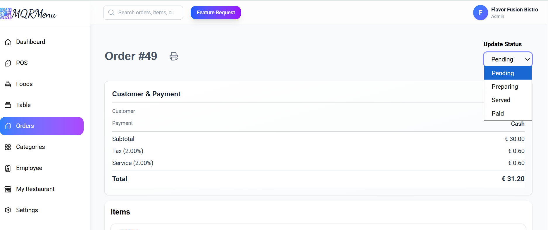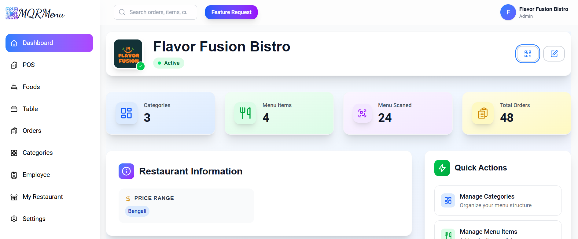 A clean, modern platform for QR code menus, realtime orders, table management, and thermal printer invoices.